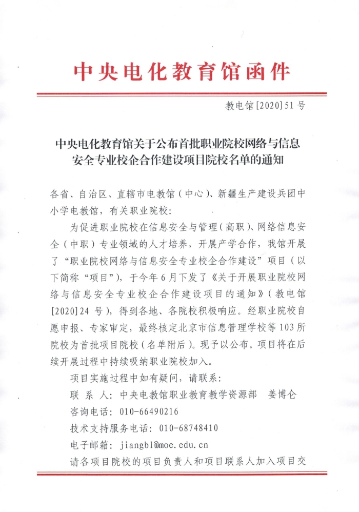 为促进职业院校在信息安全与管?span>(高职)、网络信息安?span>(中职)专业领域的人才培养,开展产学合作,中央电化教育馆于今年6月开展了“职业院校网络与信息安全专业校企合作建设”项目,我校积极组织进申报,并顺利通过审核获批?/span>