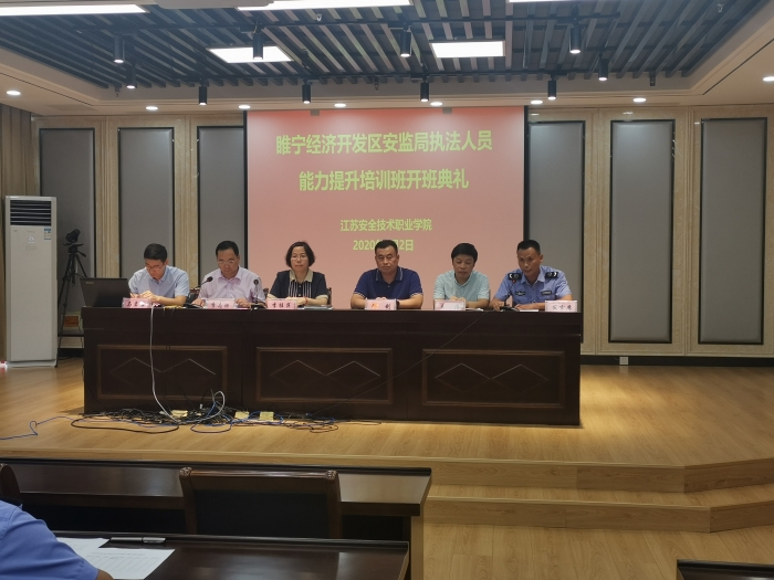 为加快推进我院高质量发展,发挥我院安全技术类专业的特色和优势,为地方经济助力发展与保驾护航,安全工程系积极开拓针对县区安检人员的能力提升工作?span>2020?span>8?span>2日,睢宁县开发区安监局首期执法人员能力提升培训班在我院云龙校区开班。学院副院长李桂萍、睢宁开发区安监局局长邢剑出席并讲话,开班仪式由安全工程系主任李志浩主持,安全工程系副主任王浩、马岩岩参加了开班典礼?/span>