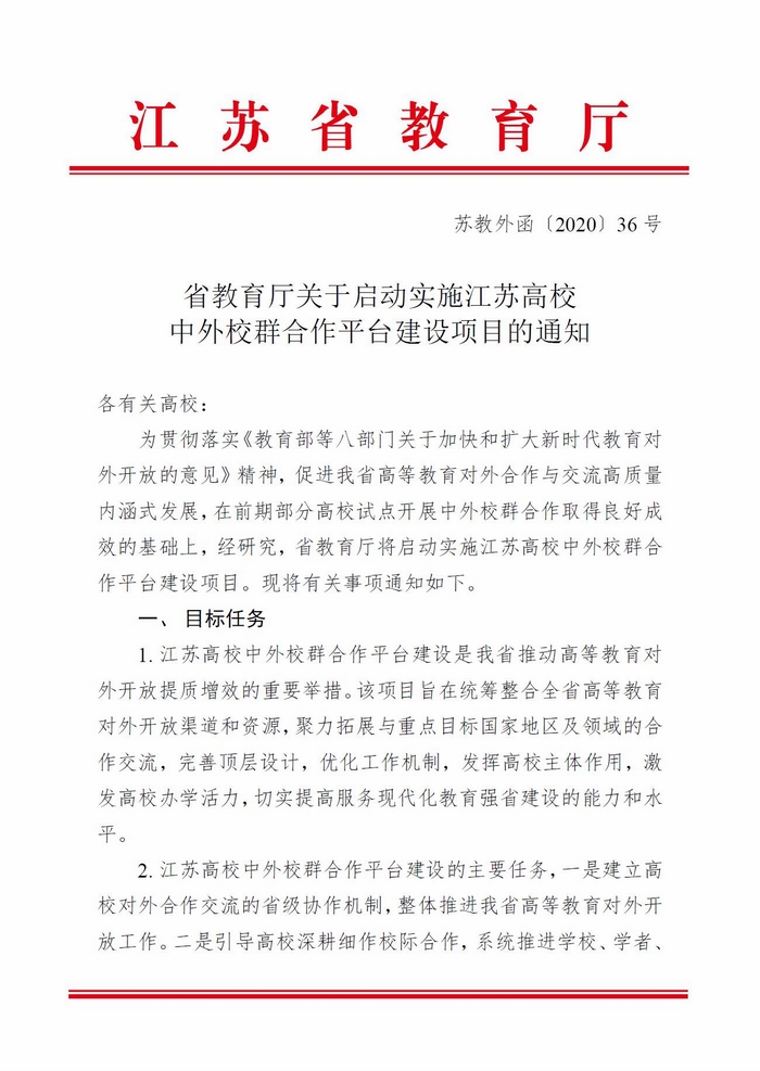 近期,江苏省教育厅发布了《关于启动实施江苏高校中外校群合作平台建设项目的通知》(苏教外函�2020�36号)�我校成功入选该项目成员单位�