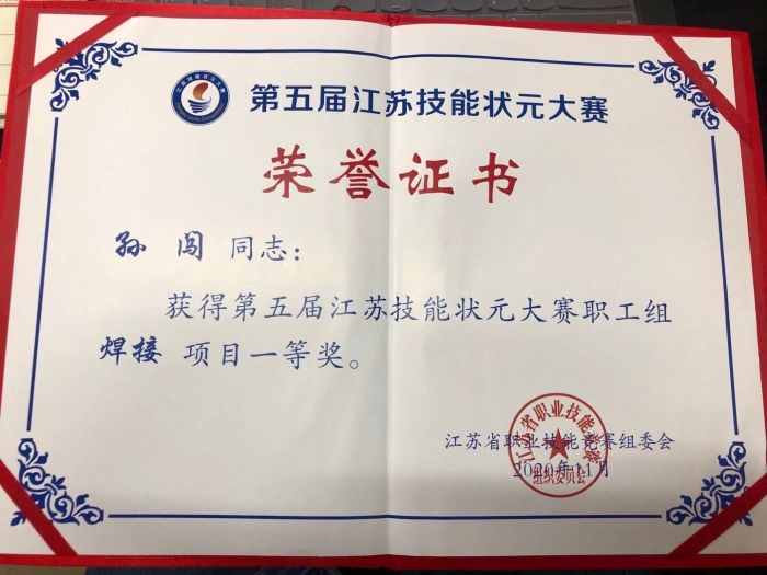 11�16日,由江苏省政府主办,省委组织部、省委宣传部、省人才办、省人社厅等16个部门共同承办的第五届江苏技能状元大赛决赛在昆山闭幕。我�17�焊接技术与自动化毕业生孙闯,代表中国能源建设集团江苏电力建设第一工程有限公司参加职工组焊接项目比赛,荣获“焊工”项�职工组第一名。被�政府授予�江苏技能状��荣誉称号,直接认定为�江苏工匠�,享受省劳动模范待遇,列入省�333工程�项目培养对象,给�10万元现金奖励�
