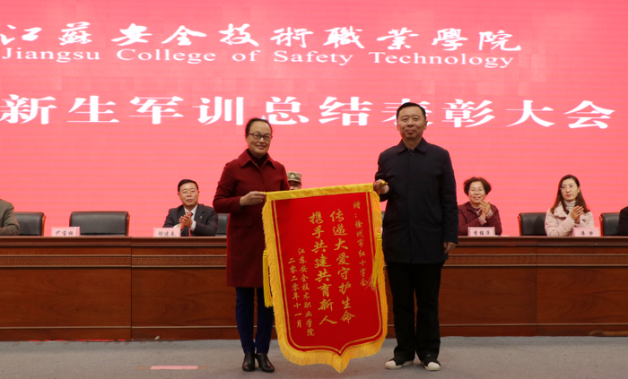 院长徐建春代表学校向部队赠送了锦旗;党委副书记孙健身代表学校向在军训中为我们组织培�396名应急救护员的徐州市红十字会赠送了锦旗�