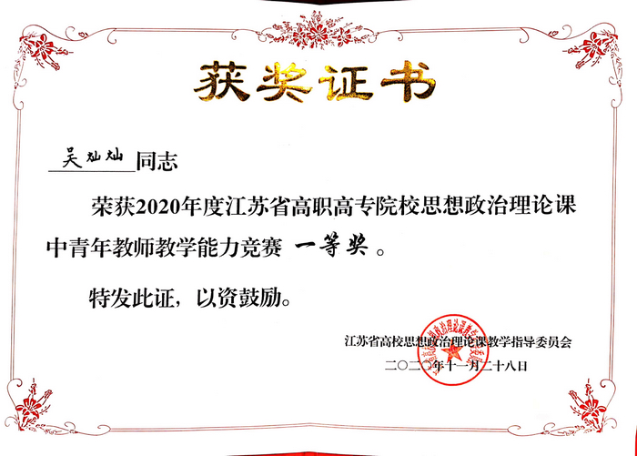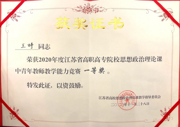 近日,在刚刚结束�江苏省第四届高职高专院校思想政治理论课中青年教师教学能力竞赛决赛中我院参赛选手喜获佳绩:吴灿灿和王婷分别获得《毛泽东思想和中国特色社会主义理论体系概论》组和《思想道德修养与法律基础》组的一等奖,我院成为唯一获得两个一等奖的单位�