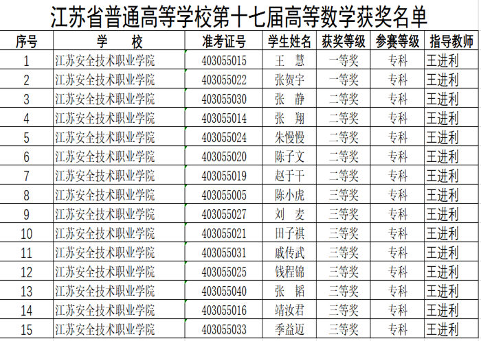 近日,由省教育厅和省高等数学教学研究会主办的江苏省普通高等学校第十七届高等数学竞赛结果揭晓,我校由王进利老师指导的学生数学竞赛团队共荣获一等奖两个,二等奖五个,三等奖八个。创下我校参赛以来的最佳成绩�