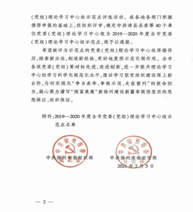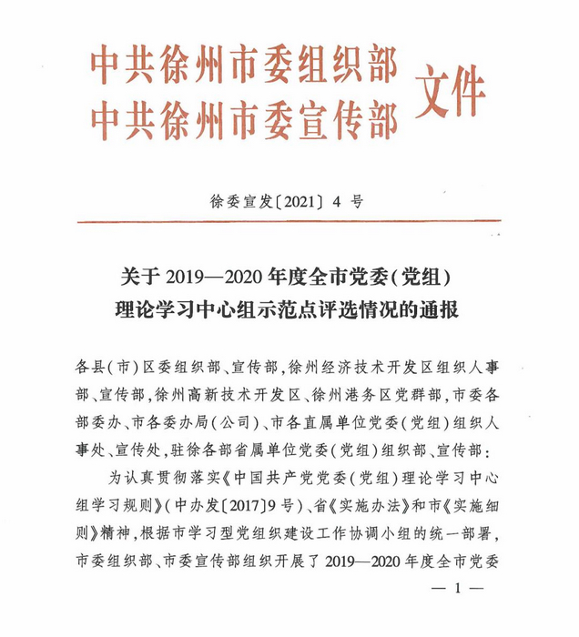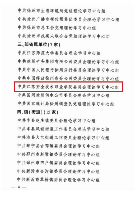 近日,徐州市委组织部、市委宣传部通报�2019-2020年度全市党委(党组)理论学习中心组示范点评选结果,中共江苏安全技术职业学院委员会理论学习中心组入选示范点名单�