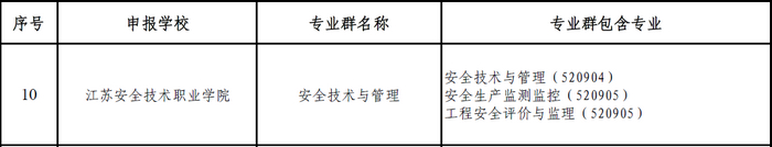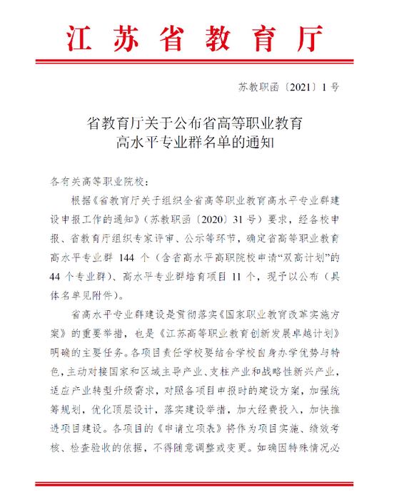 近日,从江苏省教育厅发布《省教育厅关于公布省高等职业教育高水平专业群名单的通知》(苏教职函�2021�1号)获悉,我院安全技术与管理专业群(包含安全技术与管理、安全生产监测监控、工程安全评价与监理三个专业)成功获批江苏省高水平专业群。实现了我院省级高水平专业群零的突破�