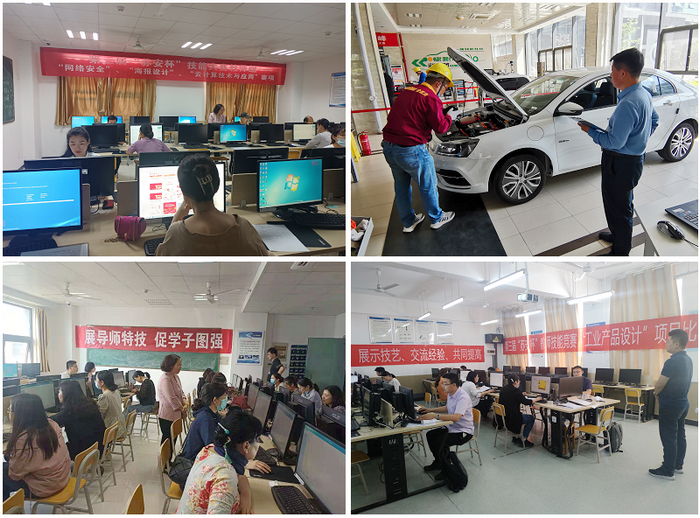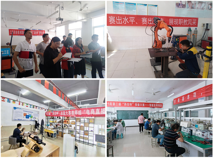 男女教师同台,巾帼不让须眉,在赛场上点燃热情,点燃梦想,点燃自信。模拟现场限时查找安全隐患,网上开展攻防实践,焊接机器人焊出�100”小试身手,新能源汽车检修快速规范,工业机器人、机电一体化设备、智能监测设备等安装、编程和调试一气呵成,工业产品设计、图形图像处理创新思维标新立异,电商直播充满热情,此次技能竞赛充分展示了我院各专业的建设成果�