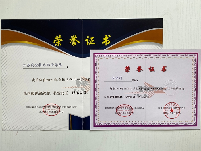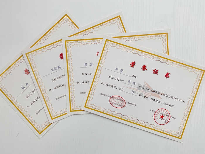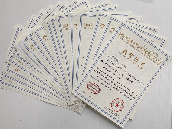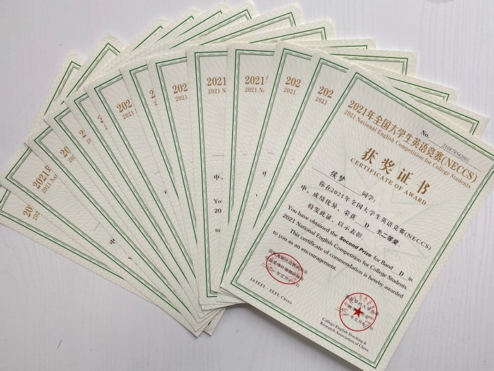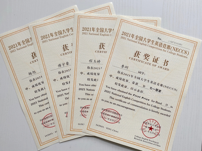 近日,从2021年全国大学生英语竞赛(NECCS)组委会传来捷报,我院杨旭、傅宇豪、程玉婷、李珂等4名学生获�D类(适用于体育类和艺术类本科生及非英语专业高职高专学生参加)全国一等奖、侯梦等13名学生获得全国二等奖、高智超�22名学生获三等奖。宋伟莉、张婷、周莹等3名指导教师受到表彰,宋伟莉老师荣获个人“优秀组织�”。我院荣获单�“优秀组织�”�
