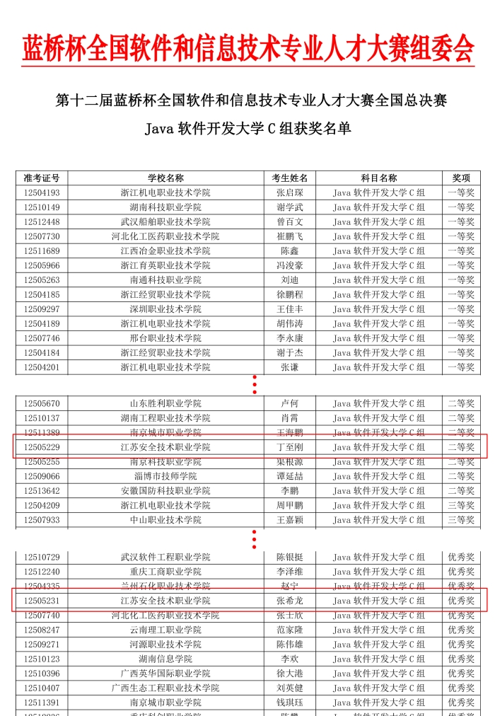 �4月中旬的江苏赛区选拔赛上,丁至刚、张希龙两位同学表现突出,双双获�Java软件开发赛项大�C组一等奖,并入围全国决赛。在全国总决赛上,丁至刚同学获得个人赛软件类Java软件开发赛项大�C组二等奖,张希龙同学获优秀奖�