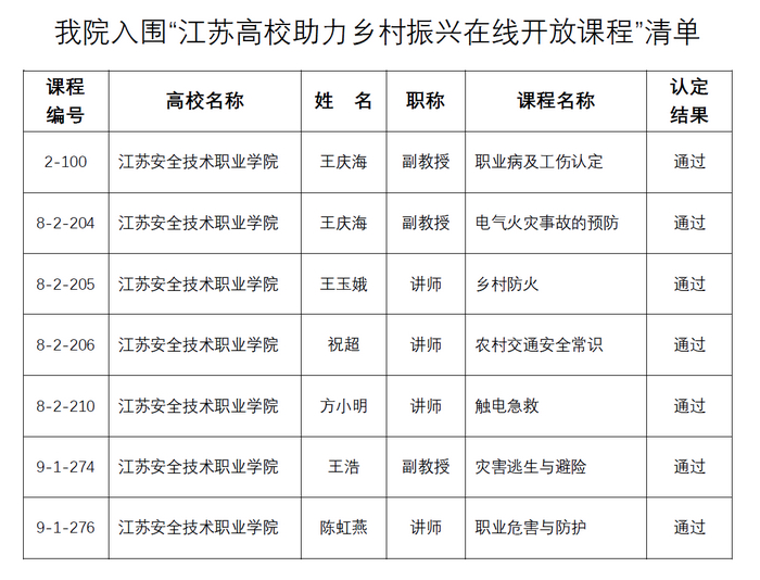 根据江苏省教育厅《关于征集江苏高校助力乡村振兴在线开放课程的通知》(苏教办高函�2021�8号),经学院推荐申报、专家认定、省教育厅审核,我院工业安全与职业健康学院申报的6门课程、电气工程学院申报的1门课程,总计7门课程通过“江苏高校助力乡村振兴在线开放课�”的评审,入围江苏高校助力乡村振兴在线开放课程�