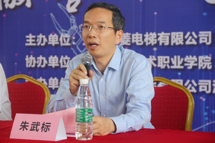 朱武标代表上海三菱电梯有限公司对本次比赛的顺利举行表示祝贺。朱武标简要介绍了上海三菱电梯有限公司近年来的发展情况,对学院长期以来支持电梯行业,为行业和公司培养了众多高技能的电梯人才表示感谢。他希望,在学校、专家、裁判、选手们的共同努力下,将本次比赛办成一场安全有序、高水平的赛事�