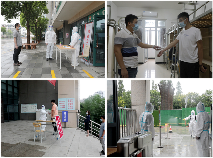 参演人员按照我院最新的疫情防控要求,在校门入校核验处、学生宿舍、学生教室、学生餐厅等地分角色分场景进行防控演练,模拟演练了学生返校核验、体温异常者复检、餐厅就餐、环境消杀等应急程序及要求。安保处校园防控负责人员分别在各演练模拟点对疫情防控工作和应急处理流程进行讲解,各演习人员分工合作协同配合,观演人员认真观看仔细记录,整个演练过程高效、有序,圆满完成各项演练任务?/span>9?/span>5日,我院还在云龙校区对学院全体教职工进行了核酸检测?/span>