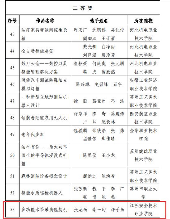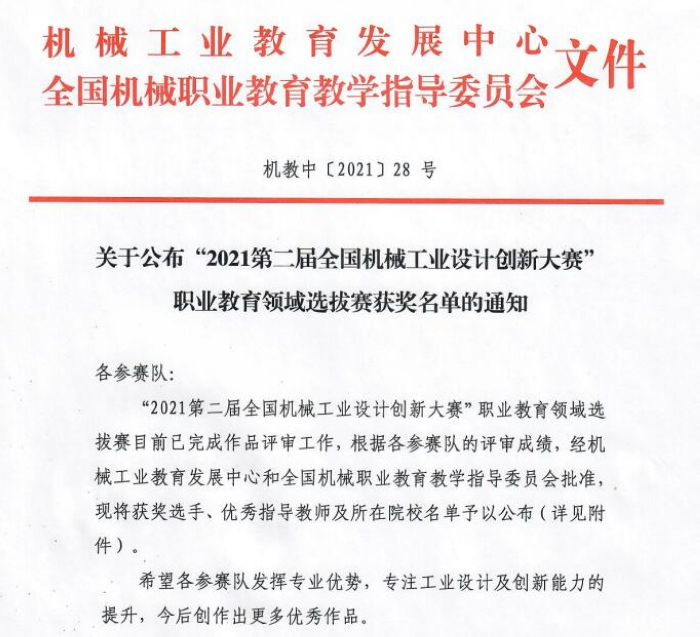 �2021第二届全国机械工业设计创新大赛”职业教育领域选拔赛结果于近日公布。经过机械工业教育发展中心和全国机械职业教育教学指导委员会批准、层层选拔、激烈的角逐,朱帅帅、段焜老师指导下的电气工程学院张龙杨、李一昀、许子扬三名同学提交的作品《多功能水果采摘包装机》荣获二等奖,朱帅帅、黄传翔老师指导下的孙运飞、崔云智、李亚三名学生提交的作品《智能电梯消杀净化系统》荣获三等奖�