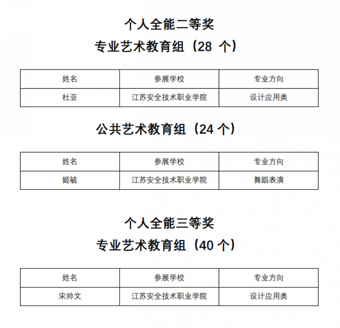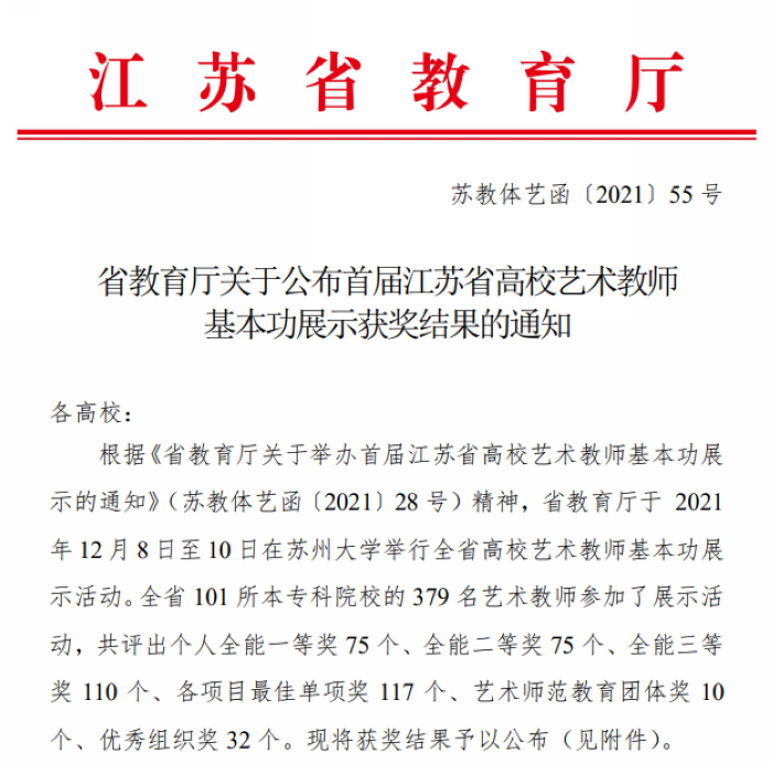 近日,江苏省教育厅发布《关于公布首届江苏省高校艺术教师基本功展示获奖结果的通知》(苏教体艺函�2021�55 号)�我院杜亚老师荣获专业艺术教育组个人全能二等奖,姬毓老师荣获公共艺术教育组个人全能二等奖,宋帅文老师荣获专业艺术教育组个人全能三等奖�