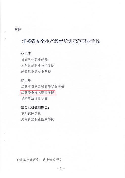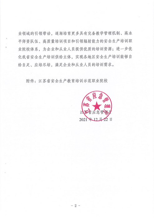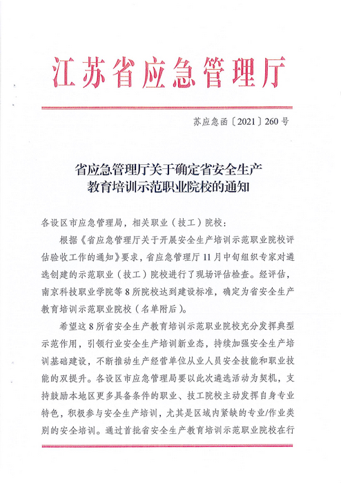 2021�12�21日,江苏省应急管理厅发布《关于确定省安全生产教育培训示范职业院校的通知》(苏应急函�2021�260号),我院被认定为首批“江苏省安全生产教育培训示范职业院校”�