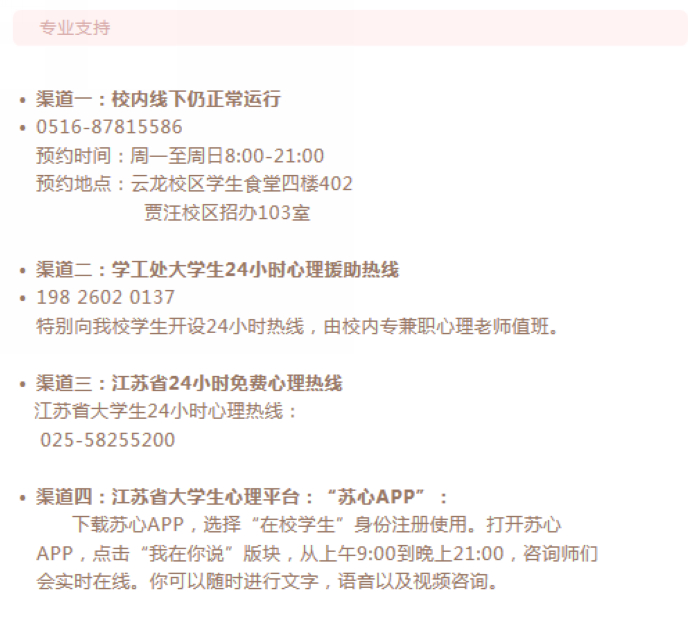 开展浸润式心理健康教育活动,构筑“保健”防线。省24小时心理热线和苏心App、学�24小时心理热线,帮助学生科学应对心理困扰。自开通之日起,累计接�100人次;借助“苏安学工”公众号,进行疫情防控期间心理科普和自助知识的宣传;借助�3.20”心理健康周开展“向阳携行,共创未来”心理健康教育系列主题活动,通过寻找最美校园、幸福打卡、运动打卡、心理健康主题讲座等十余项寓教于乐的活动,打卡人数超�1000人,心理讲座参与人数达到3000余人,引导大学生关注自我心理健康,增强心理保健意识;充分利用线上课堂教学主渠道作用,加大普及心理知识,培养大学生心理素质,为后疫情时代心理账户储值;利用学生干部体系,调动学生积极性、主动性,充分发挥朋辈互助作用,增强大学生自我教育、自我管理、自我服务能力�